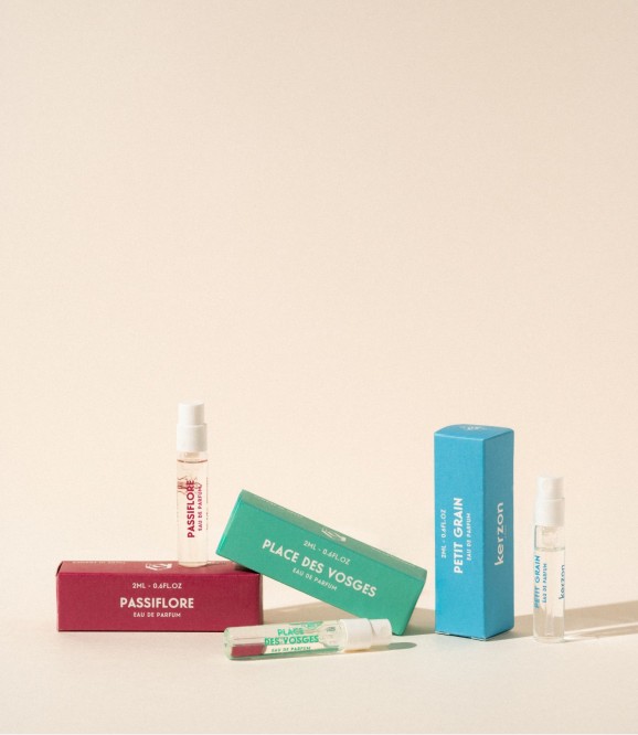 Discover our eaux de parfum collection with this discovery set containing 3 doses 0.6fl.oz: Passiflore, Petit Grain et Place des Vosges. Inspired by the infinite richness of nature, Kerzon eaux de parfum invite you on a unique olfactory journey, exploring delicate petals, woody bark, sun-kissed fruit and aromatic herbs.