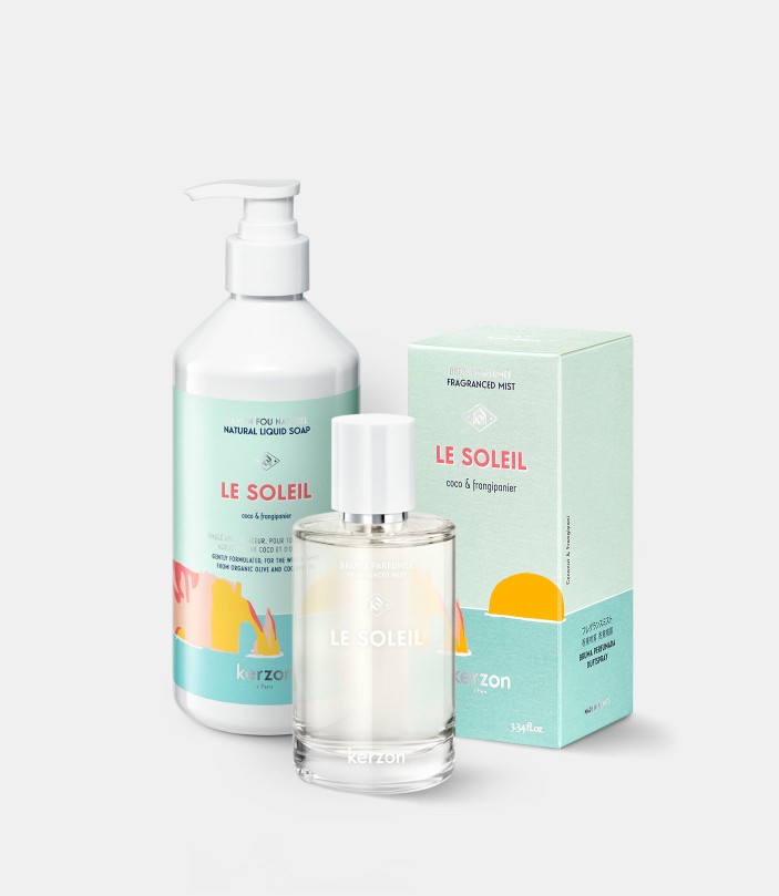 A deux c'est mieux ! Profitez de ce duo Le Soleil composé de la brume parfumée et du savon liquide pour nettoyer en douceur et parfumer délicatement les mains et le corps.