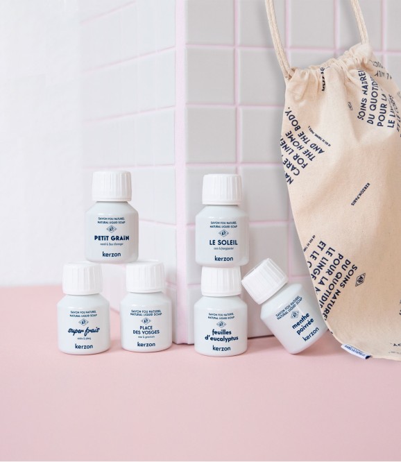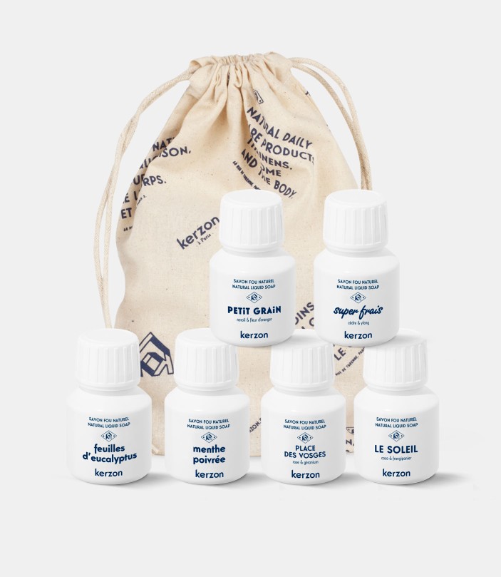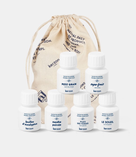 Découvrez et testez nos savons liquides avec ce kit de six doses : Feuilles d'Eucalyptus, Menthe Poivrée, Place des Vosges, Le Soleil, Super Frais et Petit Grain, le tout dans notre super pochon en coton bio. Trouvez votre préféré, vous ne pourrez plus vous en passer !